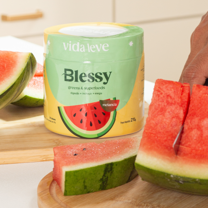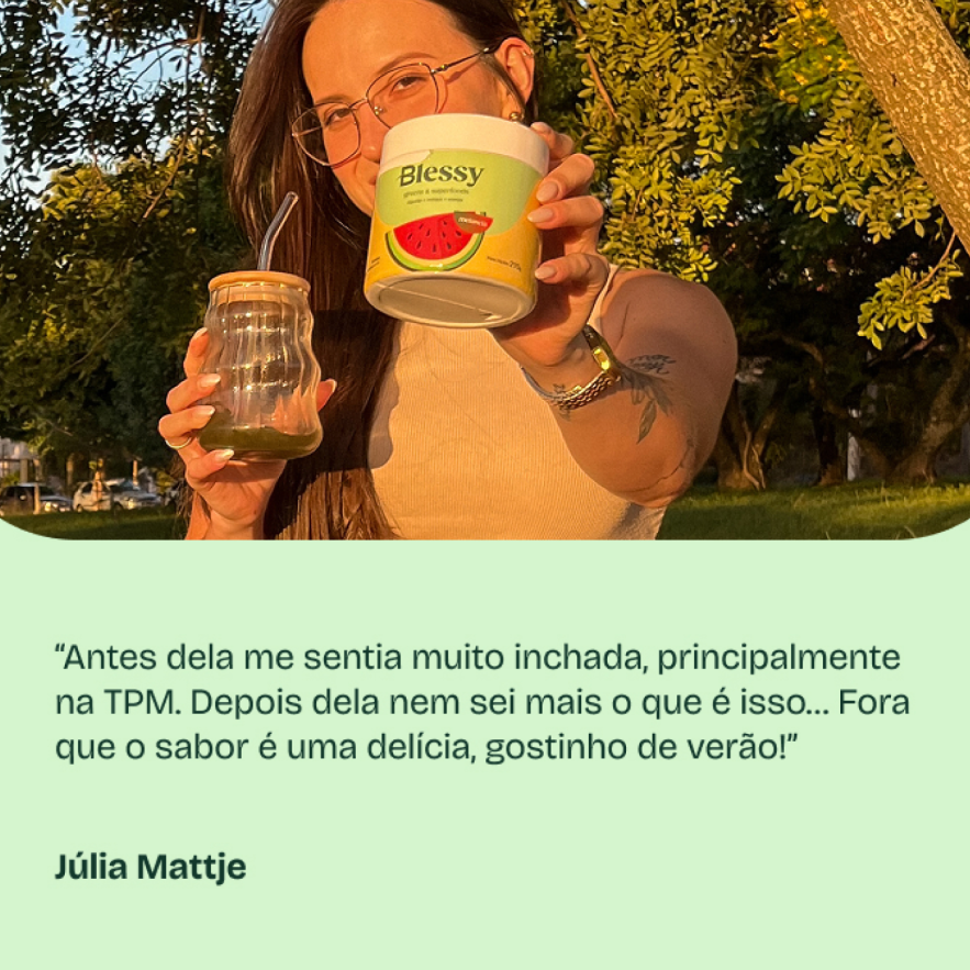 Feita com 36 ingredientes selecionados que o corpo da mulher ama, Blessy vai aliviar seu inchaço, regular sua digestão e te dar energia com muuuuito sabor. 💚